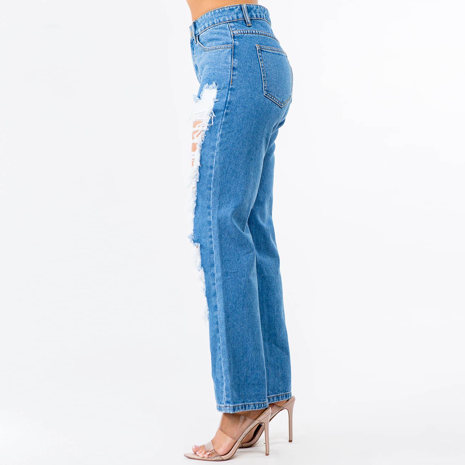 HIGH WAIST DISTRESSED STRAIGHT JEANS - BUTTON WAIST CLOSURE - DISTRESSED TRIMS FRONT - NON STRETCH, STRAIGHT LEG SIZE S : WAIST - 28 INCH, INSEAM - 30 INCH *JUNIOR SIZING IN GENERAL IS MORE FITTING AND SITS TIGHTER AVAILABLE IN JUNIOR SIZING ONLY IMPORTED, DESIGNED IN USA
